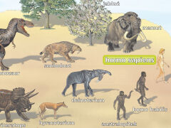 Ścienna plansza szkolna do biologii w formie taśmy czasowej, przedstawiająca ewolucję świata ożywionego od powstania życia w morzu do człowieka.