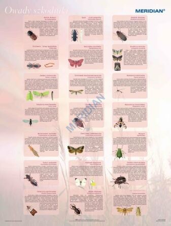 Ścienna plansza szkolna do biologii z cyklu bioróżnorodność Polski przedstawiająca 21 gatunków owadów szkodników spotykanych w naszym kraju. Metryczka każdego gatunku składa się z polskiej oraz łacińskiej nazwy, rysunku i opisu.