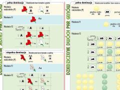 Ścienna plansza szkolna do biologii przedstawiająca przystępnie prawa Mendla. Zilustrowany jest proces dziedziczenia barw kwiatów u grochu z pełną dominacją oraz u kwiatów wyżlinu z niepełną dominacją. W drugim kartonie bocznym przedstawiony jest proces dziedziczenia kształtów i barw nasion u grochu.