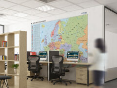 Mapa przedstawiająca najbardziej aktualny podział polityczny Europy. Układ państw i ich granice oraz główne miasta i regiony pokazane są na tle reliefu powierzchni ziemi. Na mapie pokazano sieć głównych dróg, ważne linie promowe, największe lotniska i porty morskie. Zaznaczono także granice sektorów ekonomicznych na Morzu Północnym. Z boku mapy umieszczone jest tabelaryczne zestawienie najważniejszych danych o wszystkich państwach europejskich. Znajdziemy tam takie informacje jak: powierzchnia, ludność, waluta, język oficjalny oraz flaga.