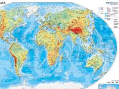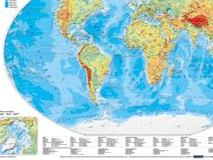 Ścienna mapa gabinetowa przedstawiająca ukształtowanie powierzchni świata. Klasyczna, poziomicowa mapa fizyczna została wzbogacona dodatkowo o informacje na temat ochrony środowiska. Umieszczone są na niej rezerwaty biosfery wpisane na światową listę dziedzictwa UNESCO, a ich lista wypisana jest pod mapą. W treści mapy znajdują się również prądy morskie, z podziałem na ciepłe i zimne oraz podział na strefy czasowe. W kartonach bocznych umieszczone są następujące mapy: