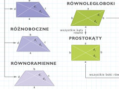 Ścienna plansza szkolna do matematyki przedstawiająca podział czworokątów na podstawie długości i ułożenia ich boków oraz na podstawie ich kątów. Przejrzysty układ ułatwia klasyfikację czworokątów, a także zależności między rodzajami tych figur.
