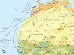 Ścienna mapa szkolna do geografii przedstawiająca różnorodność krajobrazową Afryki. Na cieniowanym podkładzie (z efektem trójwymiaru) ukazane jest rozmieszczenie najważniejszych typów krajobrazu kontynentu afrykańskiego. W treści mapy znajdują się również następujące informacje: krainy geograficzne, szczyty, wulkany, punkty wysokościowe i głębokościowe, prądy morskie, granice i nazwy państw, stanów oraz stolice i największe miasta.