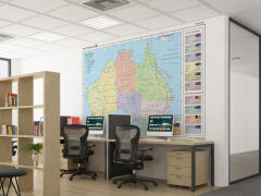 Ścienna, polityczna mapa szkolna przedstawiająca podział administracyjny Australii. Mapa prezentuje podział na stany, prowincje i terytoria, miasta, sieć dróg, a także lokalizacje znanych atrakcji turystycznych.