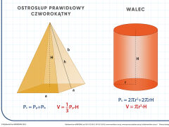 Ścienna plansza szkolna do matematyki przedstawiająca podstawowe bryły obrotowe, graniastosłupy proste oraz ostrosłupy. W czytelny i przyjazny dla ucznia sposób pozwala objaśnić zasady obliczania pól powierzchni i objętości wielościanów oraz brył obrotowych.