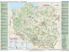 Dwustronna ścienna mapa szkolna przedstawiająca walory i bogactwo krajoznawcze Polski w ujęciu historyczno-kulturowym oraz przyrodniczym.