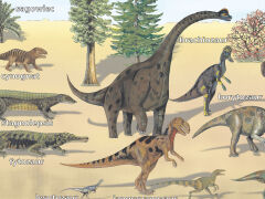 Ścienna plansza szkolna do biologii w formie taśmy czasowej, przedstawiająca ewolucję świata ożywionego od powstania życia w morzu do człowieka.