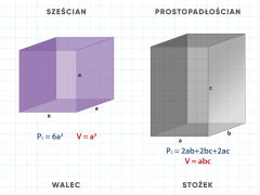Ścienna plansza szkolna do matematyki przedstawiająca podstawowe bryły obrotowe, graniastosłupy proste oraz ostrosłupy. W czytelny i przyjazny dla ucznia sposób pozwala objaśnić zasady obliczania pól powierzchni i objętości wielościanów oraz brył obrotowych.