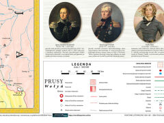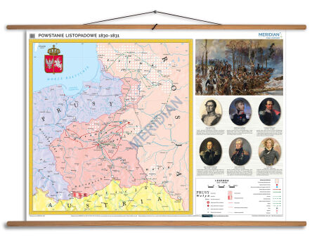 Mapa przedstawiająca ziemie polskie w czasie Powstania listopadowego i wojnę polsko-rosyjską 1830-1831. Widnieją na niej tereny działań partyzanckich, obszary koncentracji oraz przemarsze wojsk polskich i rosyjskich, bitwy zarówno wygrane jak i przegrane przez naszych rodaków, twierdze przez nich bronione, a także miejsca złożenia broni przez wojska polskie w 1831 r.
