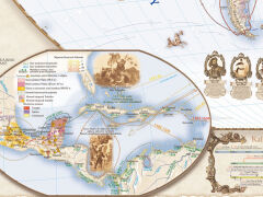 Mapa przedstawiająca obraz świata w okresie wielkich odkryć geograficznych w XV-XVI w., wyścigu państw dążących do odkrycia nowych krain, szlaków i bogactw. Ogromnej ekspansji terytorialnej i budowy podwalin pod rozwój mocarstw kolonialnych. Oprócz tras najważniejszych podróży morskich i lądowych szeroko ujęte zostały liczne tematy z dziedziny polityki, religii i gospodarki związane z podbojem i eksploracją Nowego Świata.